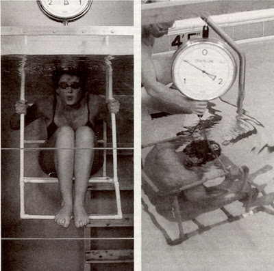What did we get for Mother’s Day? Every woman’s dream: a hydrostatic body composition test! Hydrostatic weighing is the gold standard in body fat testing – the only way to get a more accurate reading is to get cut open on the autopsy table. Hydrostatic weighing means getting weighed underwater. It works this way: fat is buoyant so it makes you float, while lean tissue (muscle, skeleton & water) are dense so they make you sink. Air also makes you float which is why you have to get every last bit that you can out of your lungs. So, the MORE you weigh under water, the LESS body fat you have. It’s the only time in my life when I was actually hoping to put up big numbers on the scale!