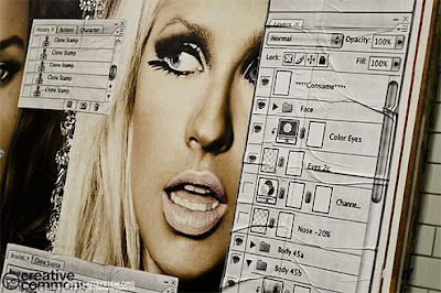 Other creative types around the world have taken up this message as well. A group of vigilantes in Berlin have been pasting large stickers showing photoshop tools over the top of too-perfect starlets and singers, as pictured here. Not only does it show the familiar clone and smudge tools but according to those who know these things (i.e. computer geeks), they actually replicate the actions obviously taken on the photos. They’re like a modern-day Robin Hood, except cooler ’cause it takes a really secure person to wear tights and tunic in today’s society.