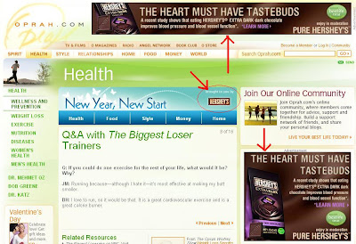 What’s wrong with this picture? The obvious answer, thanks to my Perez-style arrows (which is why you will never have to worry about me photoshopping anything on this site), is that this “health” segment on Oprah’s website is sponsored by Hersheys. Not that there is anything wrong with a little chocolate indulgence now and then (or, you know, daily.) But calling it health food and stamping it with Bob Greene’s “Best Life” seal of approval seems disingenuous at best. I’ve done Jillian Michael’s diet and exercise routine and let me tell you, chocolate is nowhere on the list of approved foods. All the trainers on The Biggest Loser will tell you that you may eat a bag of m&ms but then you may also get kicked off at the end of that show for not being committed enough to your health.