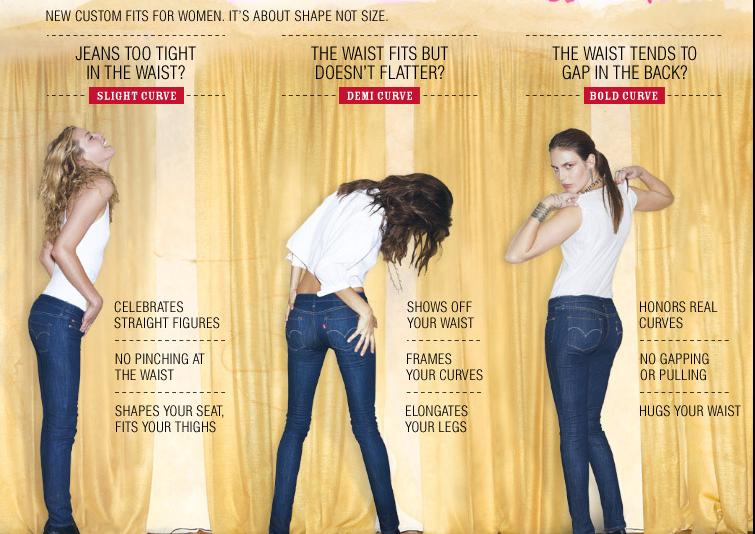 The three fits are based on the ratio of your waist to your butt. (Dear Levis, thank you for not calling them “small,” “medium,” and “large”):