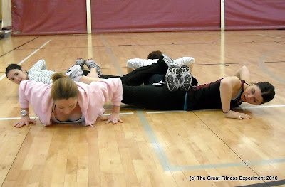 Many thanks to Gym Buddies Jeni (she of the fantastic cleavage – sorry girl, only shot we got!), Allison, Megan (in the first push-up pic) and Daria (in the second push-up pic) for repeating this about ten times until we got a decent shot and to Krista for taking the pics!