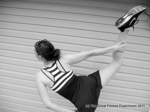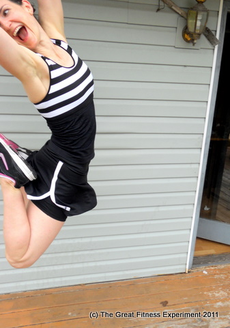 Even when I stretch it still covers all my business! Also, the Gym Buddies call this “my boobs are in jail” top. I love it. I made it by taking a striped sports bra and layering it over the top of a plain black tank. Jail chic!