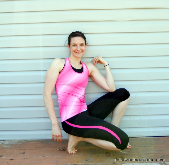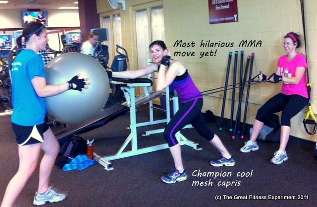 These capris were super comfy with a nice wide waistband and I love purple. As for what I’m doing well let’s just say that this month’s MMA Experiment is sure getting us a lot of weird looks in the gym! Basically you have to lunge forward, pushing against a resistance band around your hips and punch the exercise ball in front of you. (Yes we have focus mitts, for some reason this workout specified a ball…)