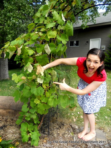 And hey, look what I found while I was having my impromptu photo shoot – GRAPES! On our grape arbor! When Gym Hubby planted these last year it was my turn to be skeptical (in all fairness he has a history of being an overly optimistic gardener) but I’ve been amazed at how well they’ve done with our 6-week growing season. If you look closely you’ll see bunches and bunches of teeny little green grapes! Totally made my day. It’s the little things.