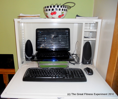 The solution to my posterior-parking problems? A standing desk. When I asked Gym Hubby for one for my birthday, he seemed skeptical. In all fairness I’m known for asking for all kinds of random things that I think are good ideas at the time and then end up being a pain in the butt. But I have three words for him: Big Metal Chicken. (If you have not read that link, you MUST. You will die laughing. In fact, I advise you to read it somewhere where you can do the snort-laugh without getting mocked). Anyhow, he was convinced of my sincerity when I jerry-rigged a standing desk out of an old Amazon diaper box, a rickety bookshelf and our first aid kit. Not only was the thing a serious hazard but it also didn’t go with our decor of Things That Have Been Licked.