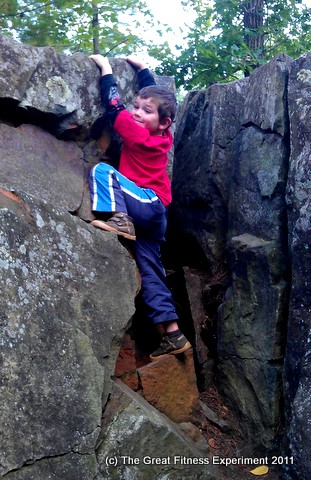 My littlest monkey is also my bravest monkey (his nickname is “danger monkey” actually – earned after we found him not even two years old and on top of the refrigerator cackling with glee) so he was all over the bouldering!