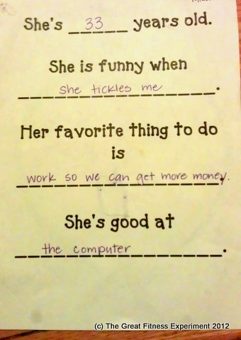 Totally off topic, but your son has amazing penmanship. Seriously! Also, it could be taken as really sweet that he thinks that you work hard for his sake! 🙂 I’m sure he meant everything in a good way.