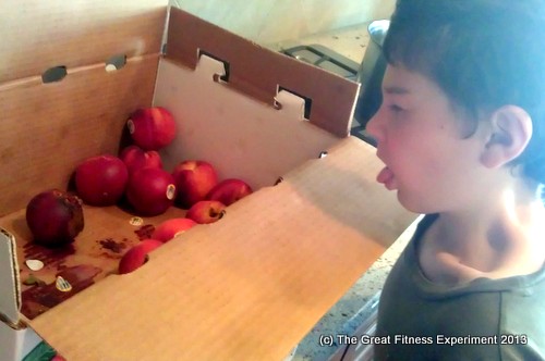 After an hour+ of all this hot-water cold-water lukewarm-water stabby business, we finally made it to the bottom of the peach box! Only to discover the stinking rotten peach that is the reason why my car smells like, well, stinking rotten peaches. Curse you, entropy!!