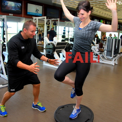 3. To do kettlebell cleans while standing like a flamingo on the flat side of a bosu WITH MY EYES CLOSED. (You should really see DeeAnn do these – she trained with him for years and her next step is the Cirque du Soleil, I swear.)