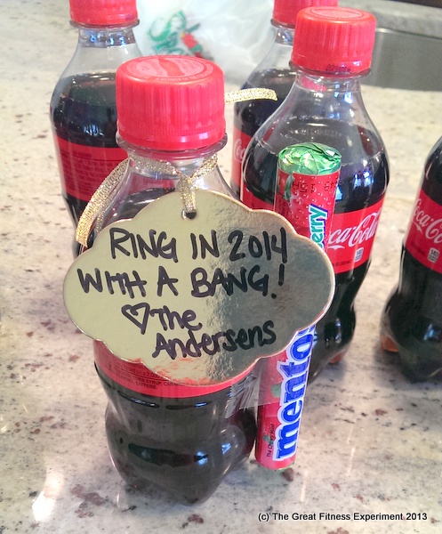 Yep, we gave them a science experiment! Mentos + Coke = party time. Nothing says “we love you and value your acquaintance” like drenching them with sticky foam! (Pretty sure that was the motto of the frat house next door in college).