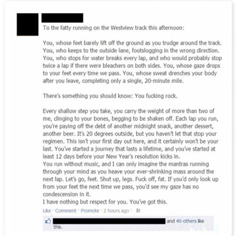“To the fatty running on the Westview track this afternoon:
