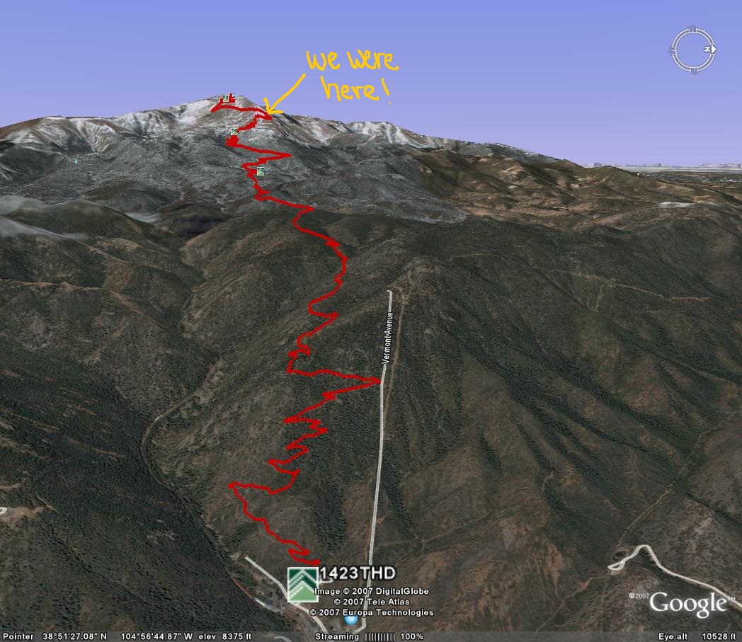 Friday we took it easy with some white water rafting on the Arkansas river through the Royal Gorge (mad props to all of you who guessed it right just based on the pictures!) but Saturday was going to be the main event. We were going to hike Pike’s Peak. Not only is it famous for its unique cuisine (I’ve lived here long enough to make Donner party jokes, right?) but because at 14,114 feet (4,302 m), it’s one of Colorado’s best known “14’ers” – or mountains over 14,000 feet. (There are 58 14’ers here and Pike’s is neither the tallest nor the most difficult but it’s still tough.)