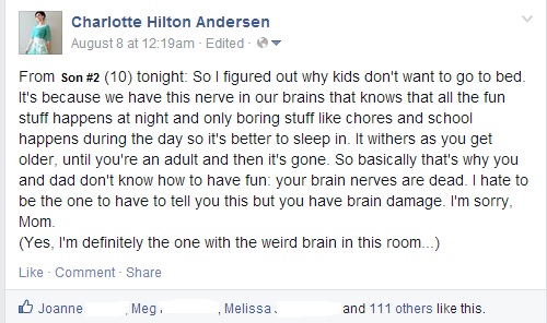 22. I loved the part about kids wanting to stay up late. Did you ever see the Growing Pains episode (s07e08) where Chrissy thinks everything fun happens when she goes to bed? The parents tell her it’s boring and agree to let her stay up one night so they can cure her. Of course, it ends up being the night when there’s a huge party, a clown, etc. She says “I’m never going to bed again!!”